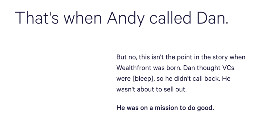 While many “About Us” pages feature chronological histories, uptight mission statements or glib manifestos, Wealthfront tells a bigger story that speaks to their customer’s hopes and fears.